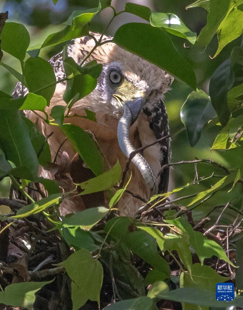 在海南番加省级自然保护区,蛇雕幼鸟在吃蛇(6月2日摄)。今年3月至7月初,经过4个多月的野外调查监测,海南番加省级自然保护区和嘉道理农场暨植物园(香港)北京代表处的科研人员,联合对番加省级自然保护区进行了一次热带雨林区域猛禽调查。