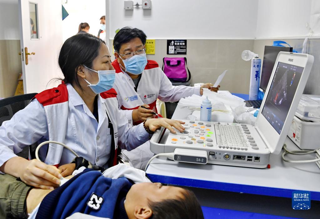 7月9日,在西藏山南市浪卡子县人民医院,来自郑州市第七人民医院的主任医师张润生(右)和彩超室主任于慧娟(左)在为一名儿童做检查。