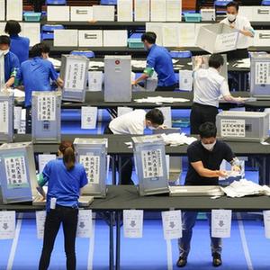 7月10日,工作人员在日本东京港区体育中心进行参议院选举投票开票作业。