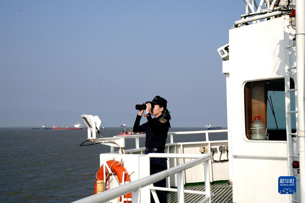 6月21日,詹春珮在“海巡01”轮上瞭望。