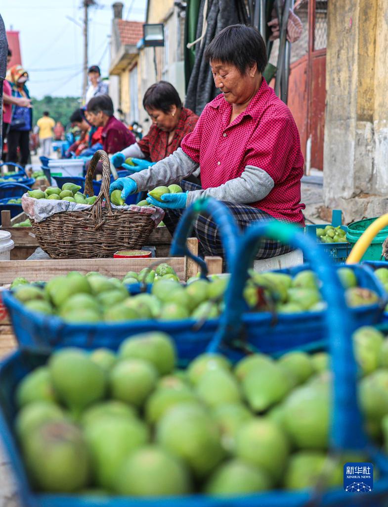 7月11日,在山东省荣成市港西镇巍巍村一处无花果交易市场,果农们分拣、装运无花果。