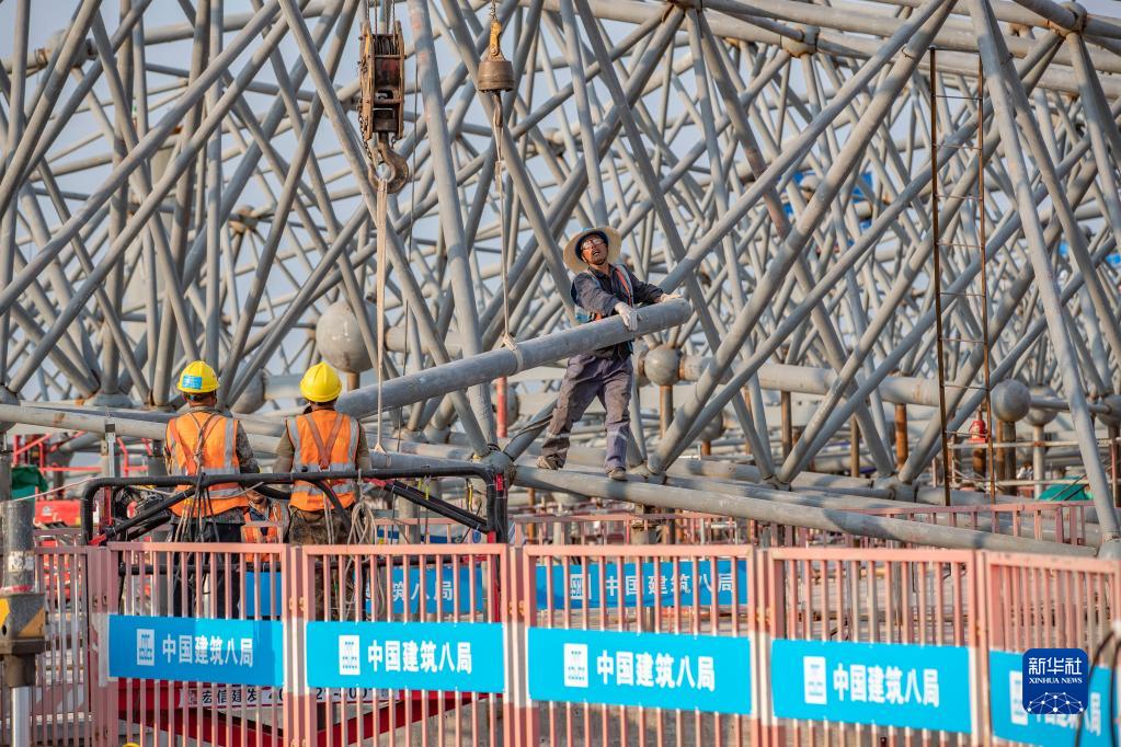 7月11日,在中建八局承建的重庆江北国际机场T3B项目施工现场,施工人员在进行钢结构网架施工。