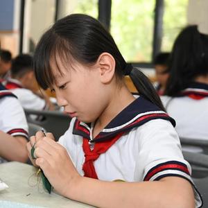 7月12日,学生在杭州市文渊小学的土布纺织技艺课堂上进行手工制作。