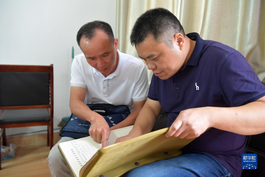 在江西省乐平市退役军人事务局,程雪清(左)在工作人员的帮助下,翻阅江西革命烈士英名录,查找他要寻找的烈士(7月6日摄)。