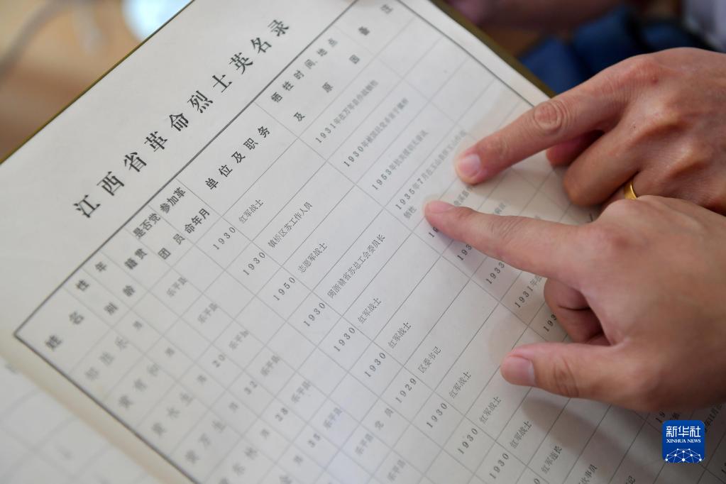 在江西省乐平市退役军人事务局,程雪清和工作人员在江西革命烈士英名录上查找他要寻找的烈士(7月6日摄)。