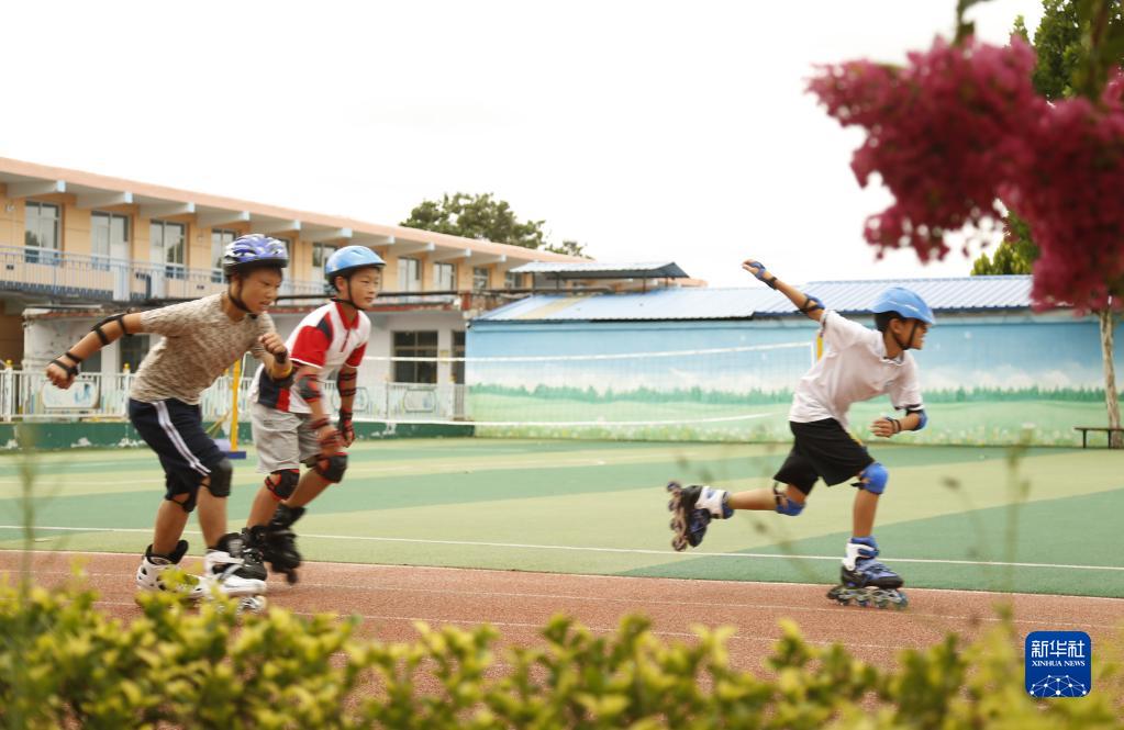 7月12日,在河北省邢台市南康庄小学,参加暑期活动的孩子们练习轮滑。