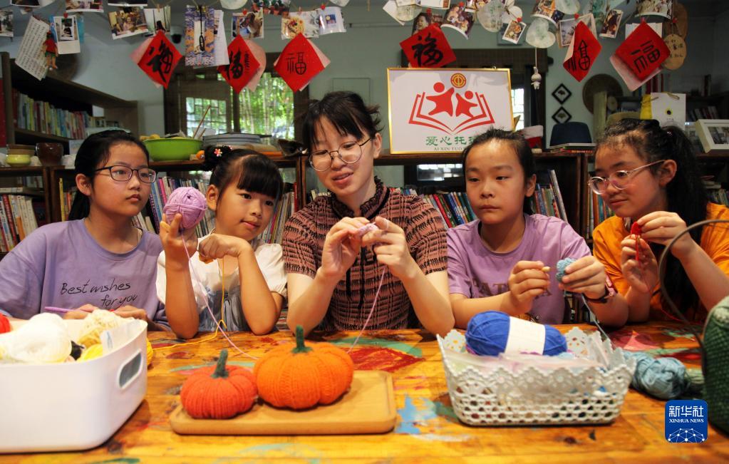 7月12日,浙江省台州市路桥区新桥镇金良社区儿童之家,小朋友在志愿者(中)辅导下学习毛衣编织。