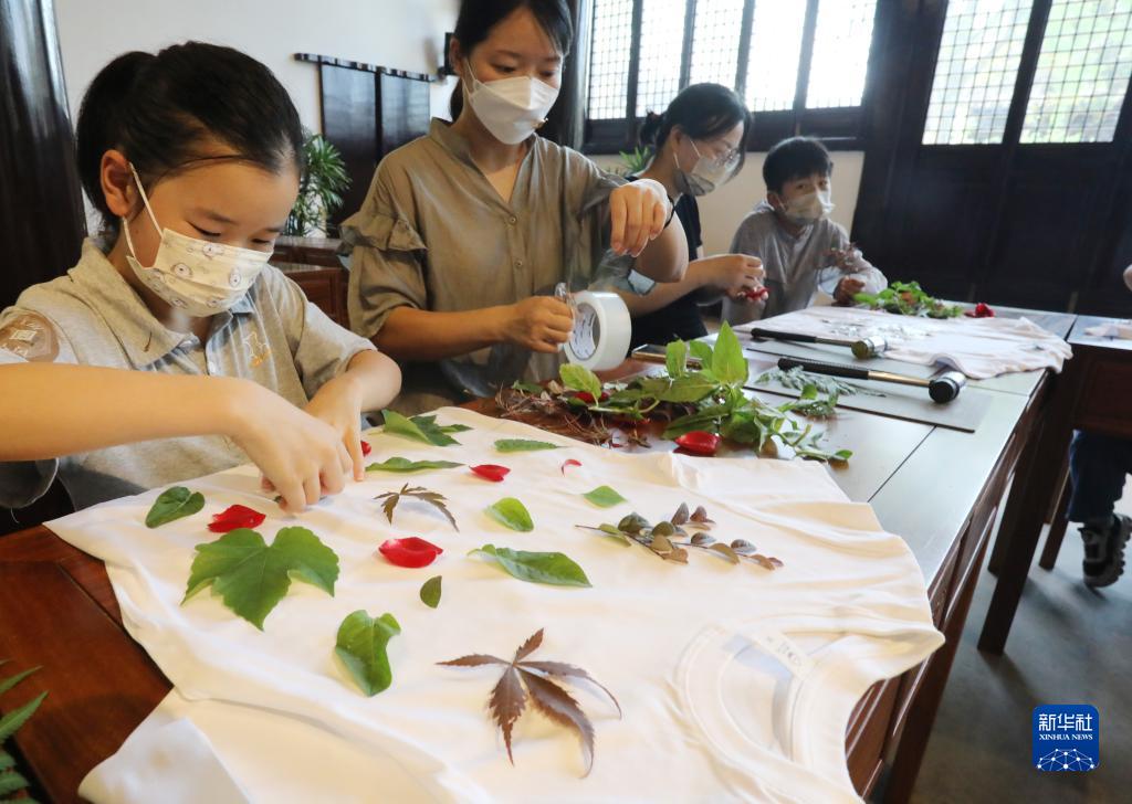 7月12日,在江苏苏州虎丘景区,家长陪同小朋友在体验植物拓染。
