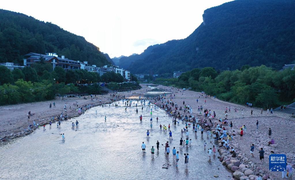 7月12日,在湖南省张家界市武陵源城区索溪河畔,人们亲水休闲(无人机照片)。