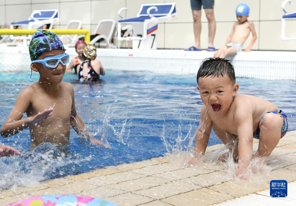7月12日,孩子们在贵州省道真仡佬族苗族自治县的游泳馆内戏水玩耍。