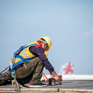 7月12日,工人在武汉天河机场T2航站楼屋面劳动。