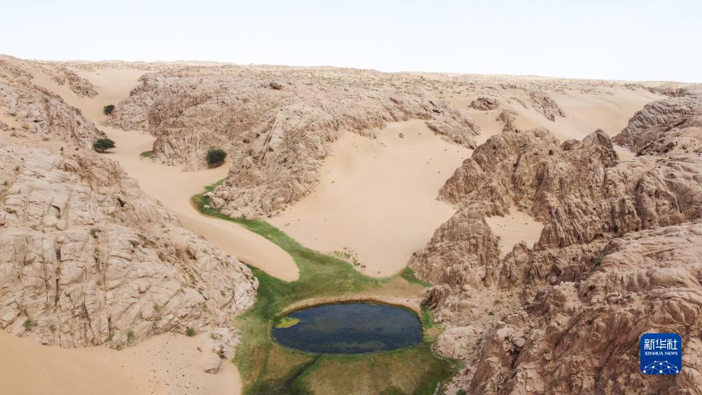 这是7月12日拍摄的阿拉善大漠天池景区风光(无人机照片)。