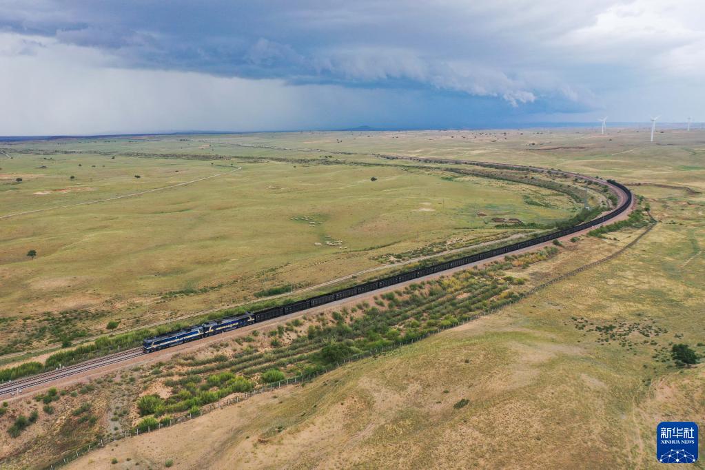 7月12日,一列满载煤炭的火车驶过锡林郭勒草原(无人机照片)。