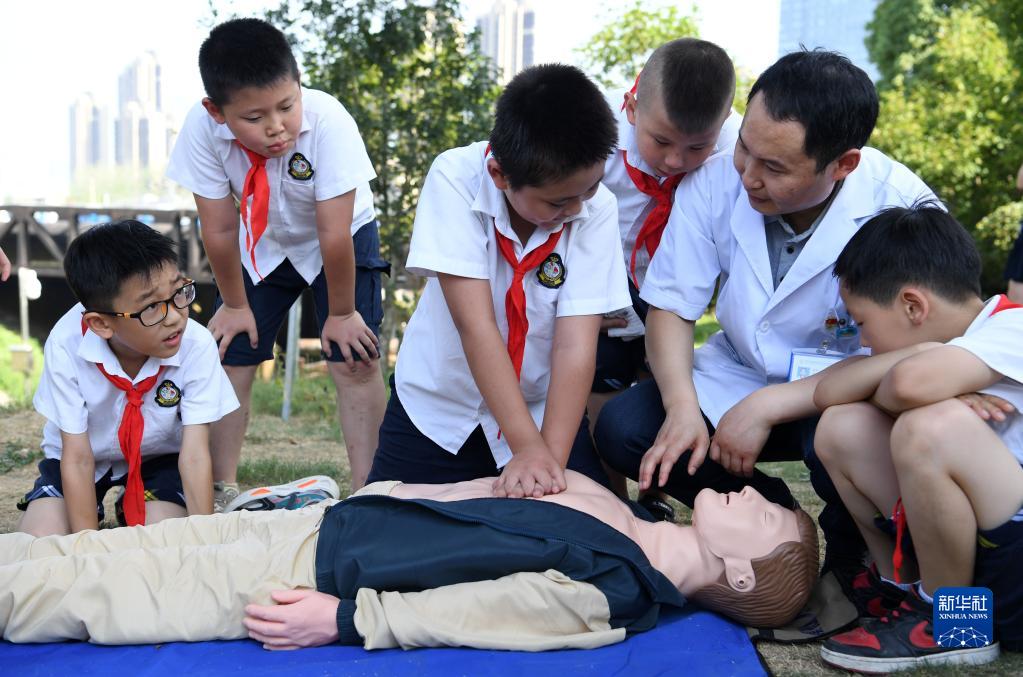 7月13日,小朋友在包河区常青街道社区卫生服务中心医生指导下学习急救知识。