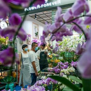 7月12日晚,两名小朋友在昆明斗南花卉交易市场内游览。 新华社记者 陈欣波 摄