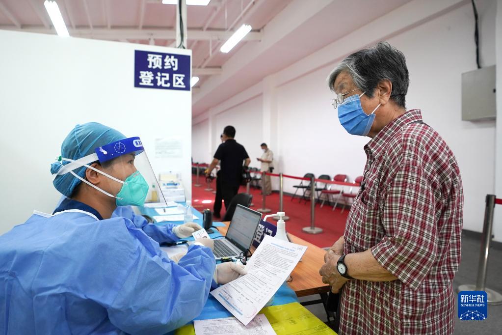 7月13日,在北京市朝阳区奥运村街道一处新冠疫苗接种点,工作人员(左)为一位接种新冠疫苗加强针的86岁市民登记信息。