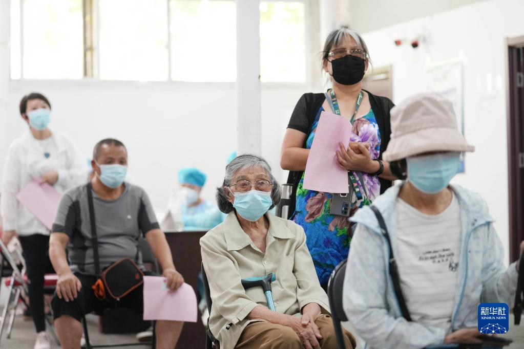 7月13日,在北京市朝阳区奥运村街道一处新冠疫苗接种点,89岁的平女士(中)在等候接种新冠疫苗加强针。