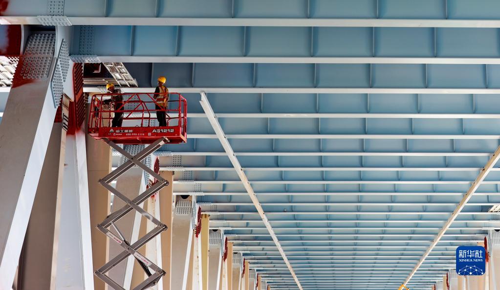 7月12日,在重庆郭家沱长江大桥下桥面的施工现场,施工人员进行螺栓紧固作业。