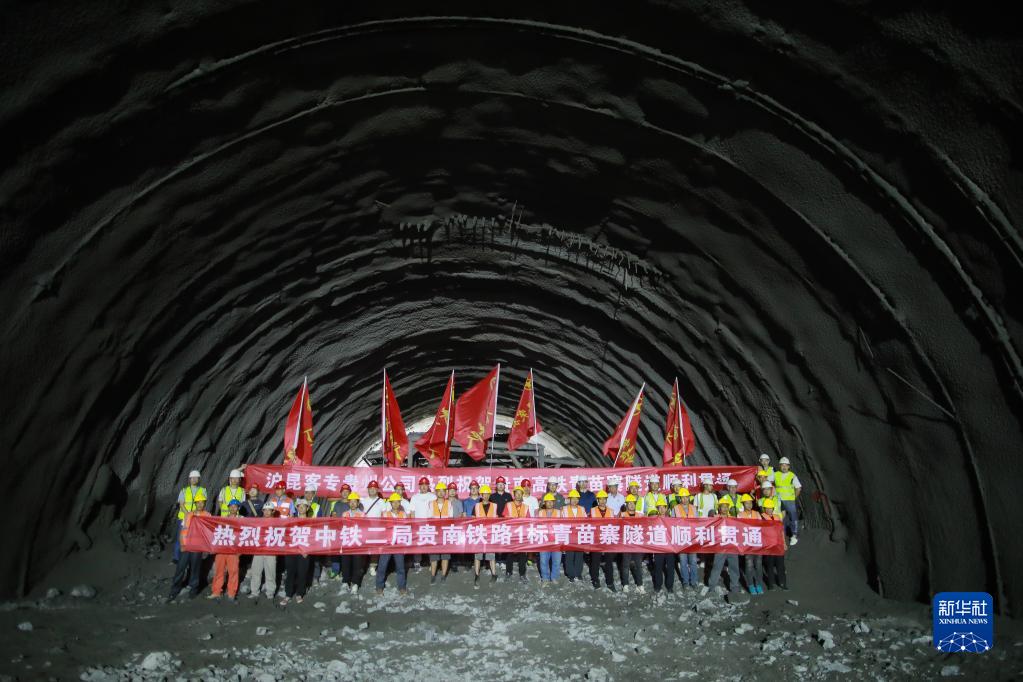 7月13日,工作人员在青苗寨隧道内庆祝贯通。