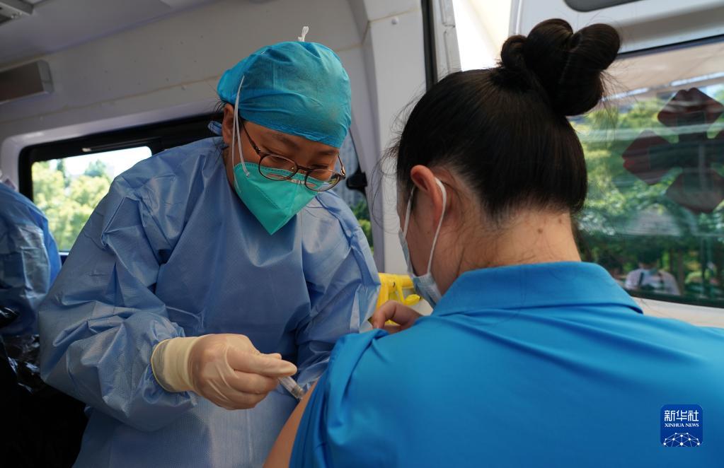 7月13日,在北京市海淀区北下关街道中国农业科学院社区新冠疫苗临时接种点,医护人员在流动疫苗接种车上为社区居民接种。