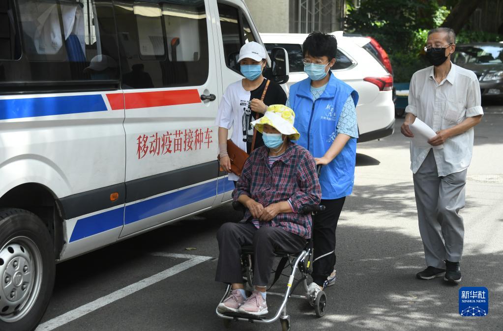 7月13日,在北京市海淀区北下关街道大柳树社区新冠疫苗临时接种点,社区工作人员(右二)陪同老人前往接种。