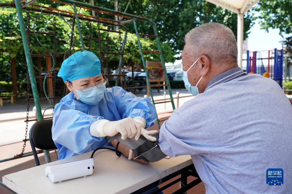 7月13日,在北京市海淀区北下关街道中国农业科学院社区新冠疫苗临时接种点,医护人员为社区老人在接种前测量血压。