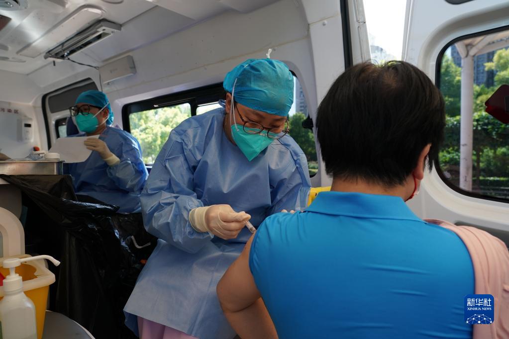 7月13日,在北京市海淀区北下关街道中国农业科学院社区新冠疫苗临时接种点,医护人员在流动疫苗接种车上为社区居民接种。