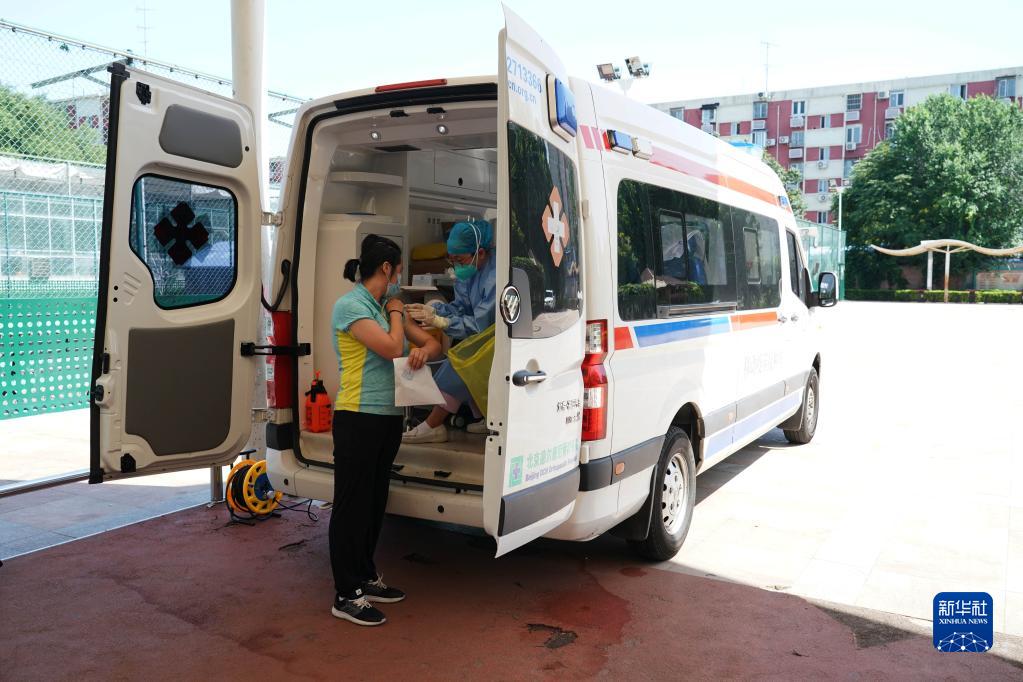 7月13日,在北京市海淀区北下关街道中国农业科学院社区新冠疫苗临时接种点,医护人员在流动疫苗接种车上为社区居民接种。
