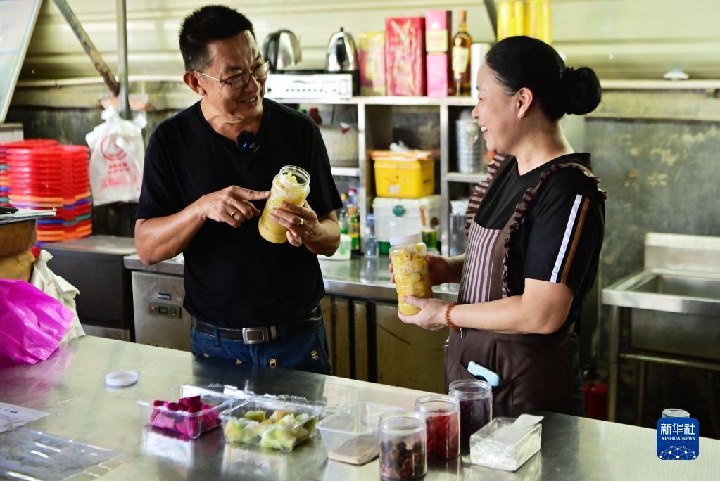 7月11日,在位于厦门市翔安区的荣杰园观光农场,农场负责人、台胞宋志平(左)在指导员工腌制水果。