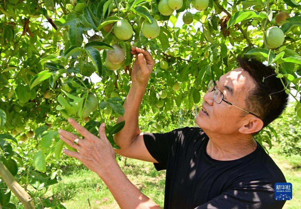 7月11日,在位于厦门市翔安区的荣杰园观光农场,农场负责人、台胞宋志平在查看百香果长势。