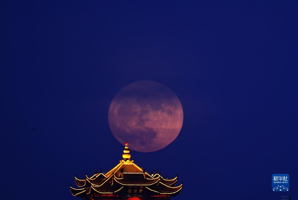 7月13日在武汉黄鹤楼附近拍摄的“超级月亮”。