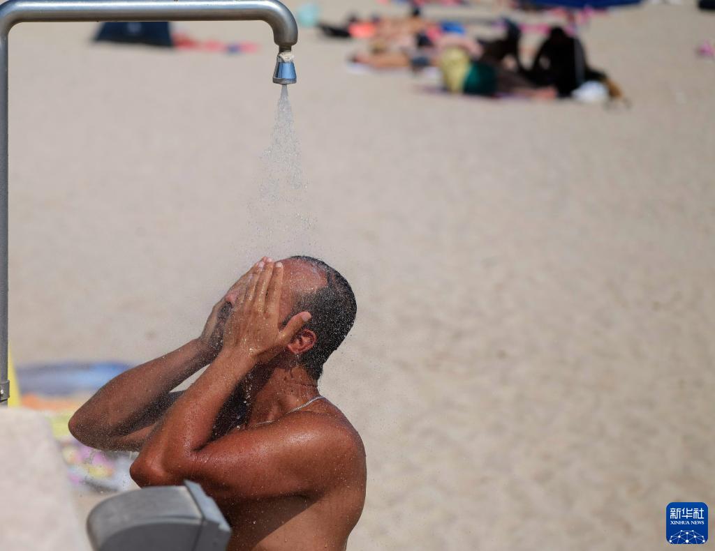 7月13日,一名男子在法国戛纳的沙滩上冲凉消暑。