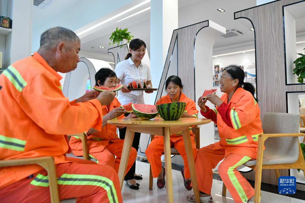 7月13日,济南烟草物流有限公司“劳动者港湾”的服务人员为前来休息的环卫工人送上西瓜解暑。
