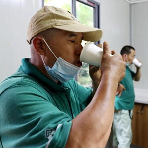 7月13日,在上海市杨浦区殷行街道的社区食堂欣益睦邻小厨,厨师在喝水休息。
