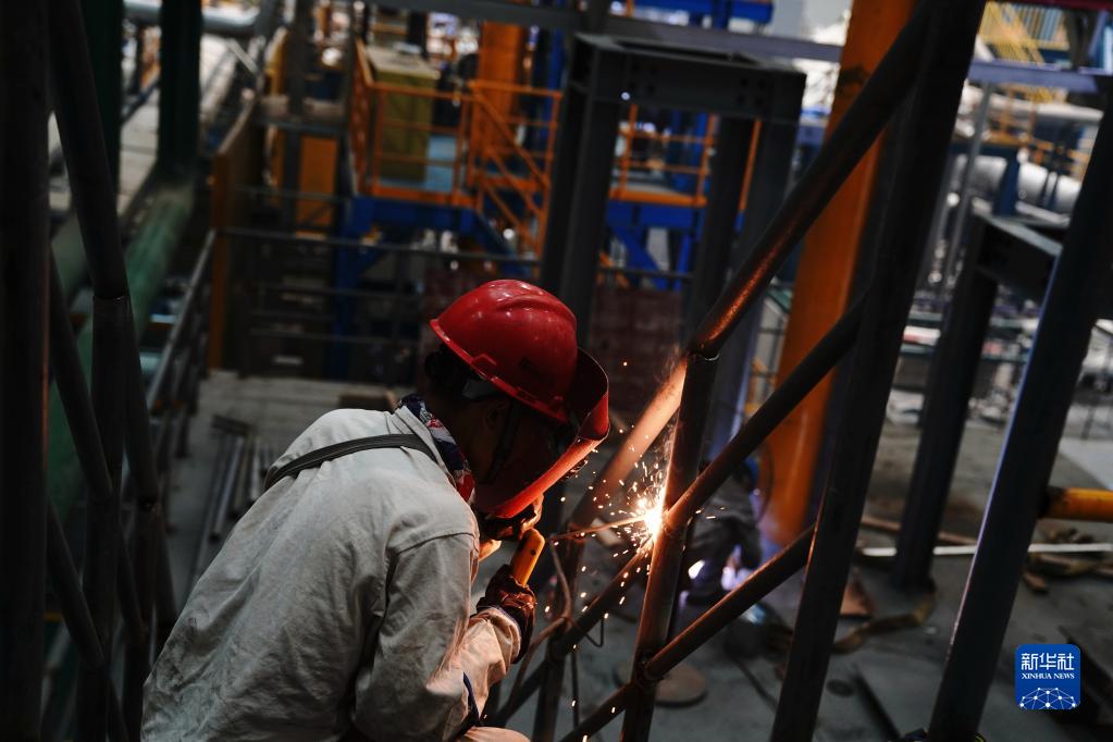 7月14日,上海核能装备测试验证中心工程技术人员在试验厂房内安装焊接。