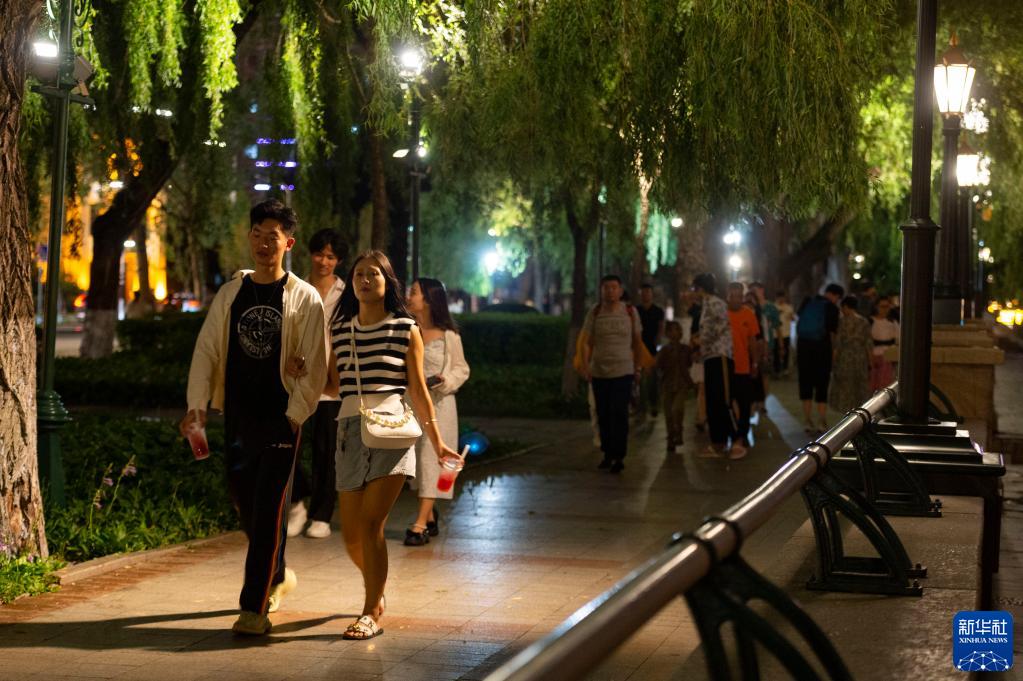 夏日夜晚,松花江哈尔滨段江畔景色优美,游人络绎不绝。