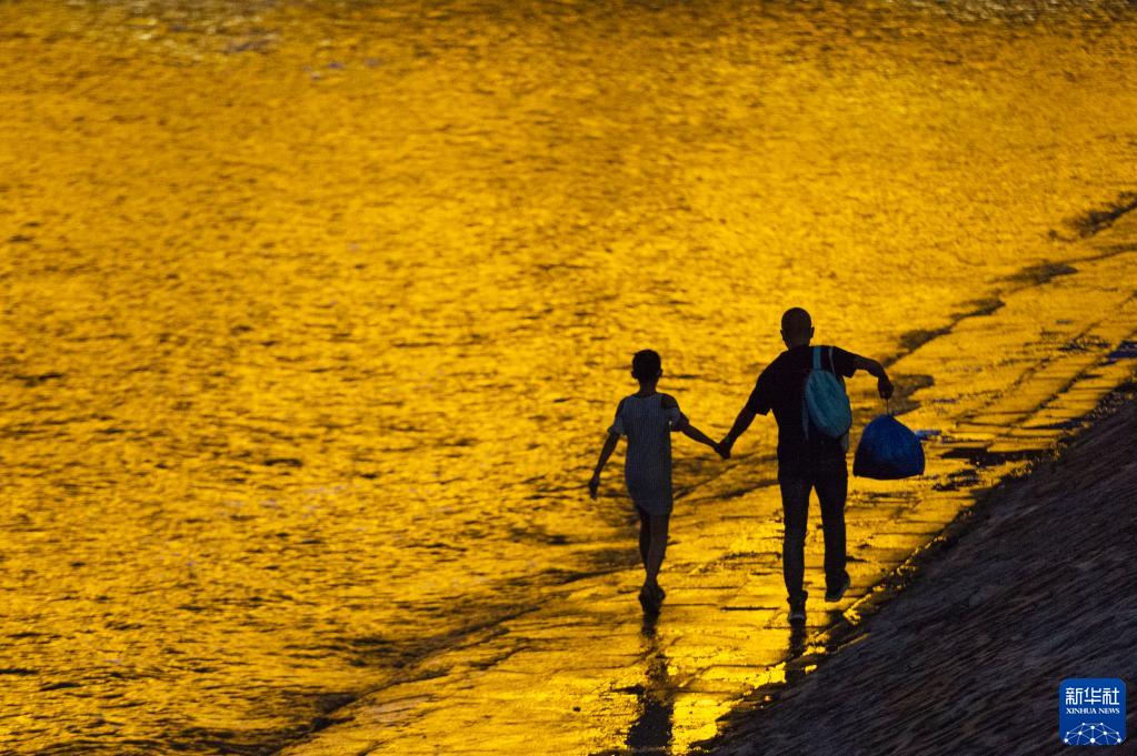 夏日夜晚,松花江哈尔滨段江畔景色优美,游人络绎不绝。