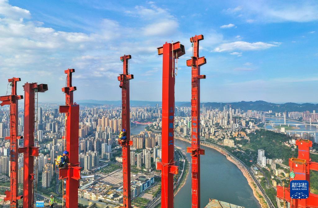 7月11日,施工人员在重庆陆海国际中心项目主塔楼楼顶进行施工作业(无人机照片)。