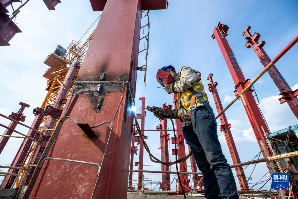 7月13日,施工人员在重庆陆海国际中心项目主塔楼楼顶进行焊接作业。 新华社发(何超 摄)