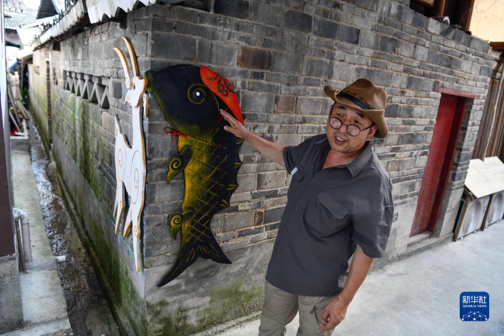 7月14日,在贵州省榕江县忠诚镇乐乡村,由守义介绍自己设计的鱼和羊装饰图案。