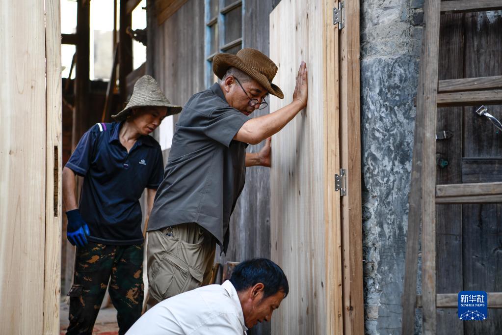 7月14日,在贵州省榕江县忠诚镇乐乡村,由守义(左二)与工人一起改造老房子。