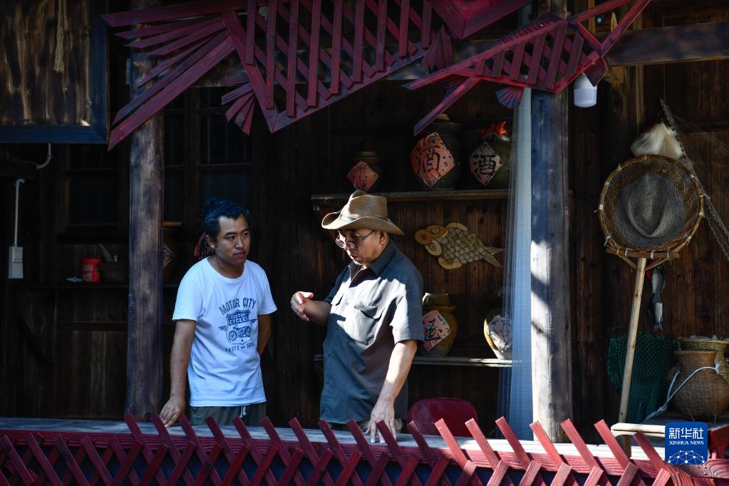 7月14日,在贵州省榕江县忠诚镇乐乡村,由守义(右)与设计团队成员在改造后的老房子前交流。