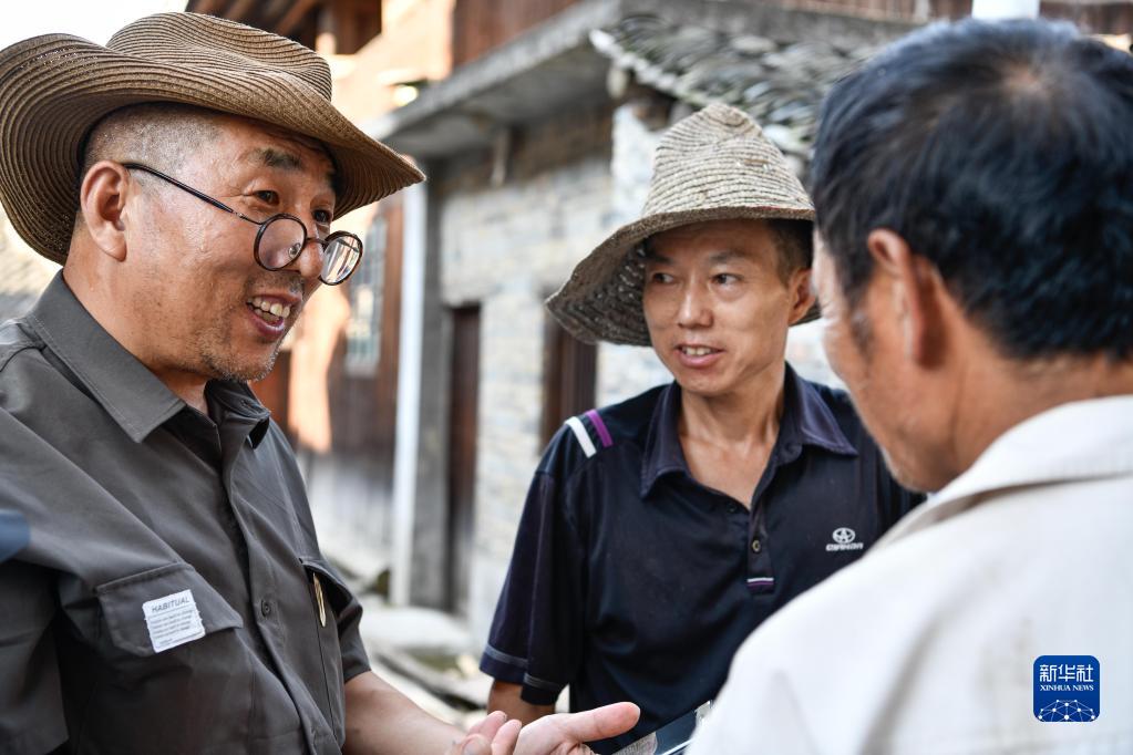 7月14日,在贵州省榕江县忠诚镇乐乡村,由守义(左一)与工人讨论改造老房子的设计图。
