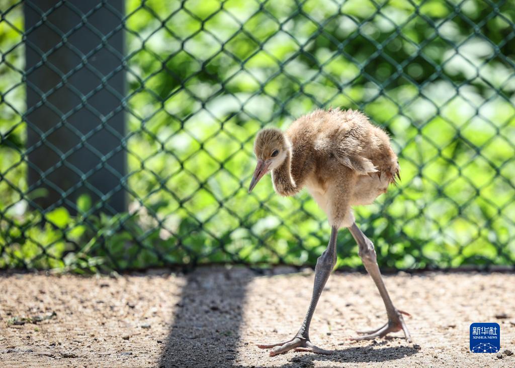 7月14日,丹顶鹤雏鸟在保护站内活动。