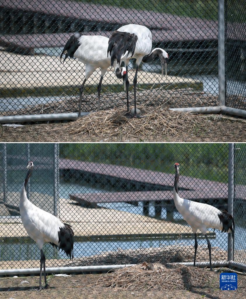 这是一张拼版照片:上图为7月13日,丹顶鹤在照看自己的蛋;下图为7月14日,丹顶鹤在守护雏鸟。