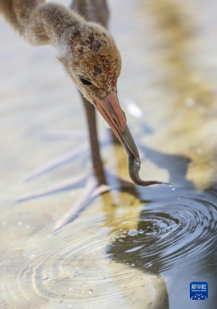 7月14日,丹顶鹤雏鸟在保护站内进食。