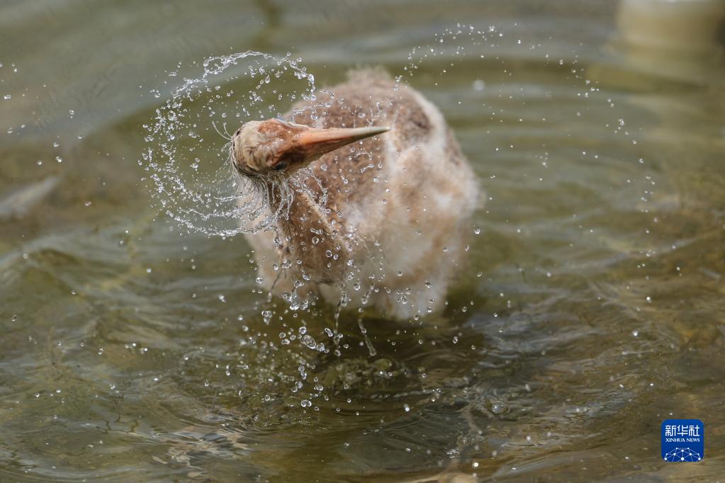 7月13日,一只丹顶鹤雏鸟在保护站内戏水。