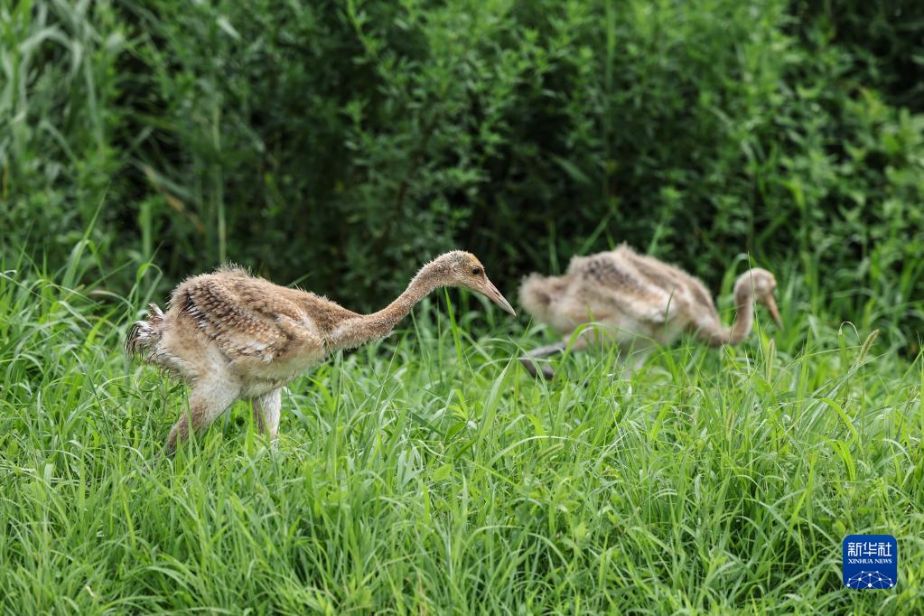 7月13日,丹顶鹤雏鸟在保护站内活动。
