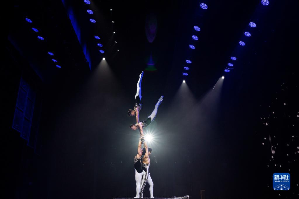 7月15日,演员在杂技节目《协奏·黑白狂想——男子技巧》的表演中。