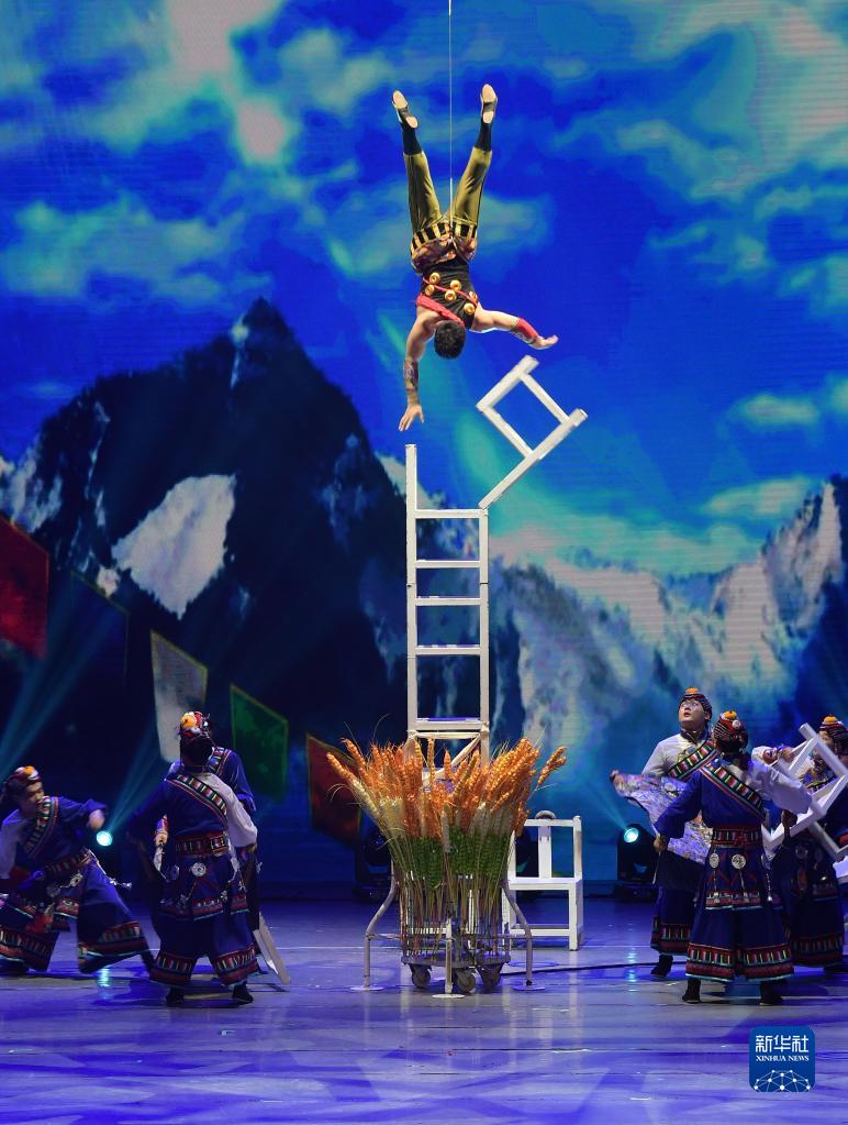 7月15日,演员在杂技节目《天路——高椅》的表演中。